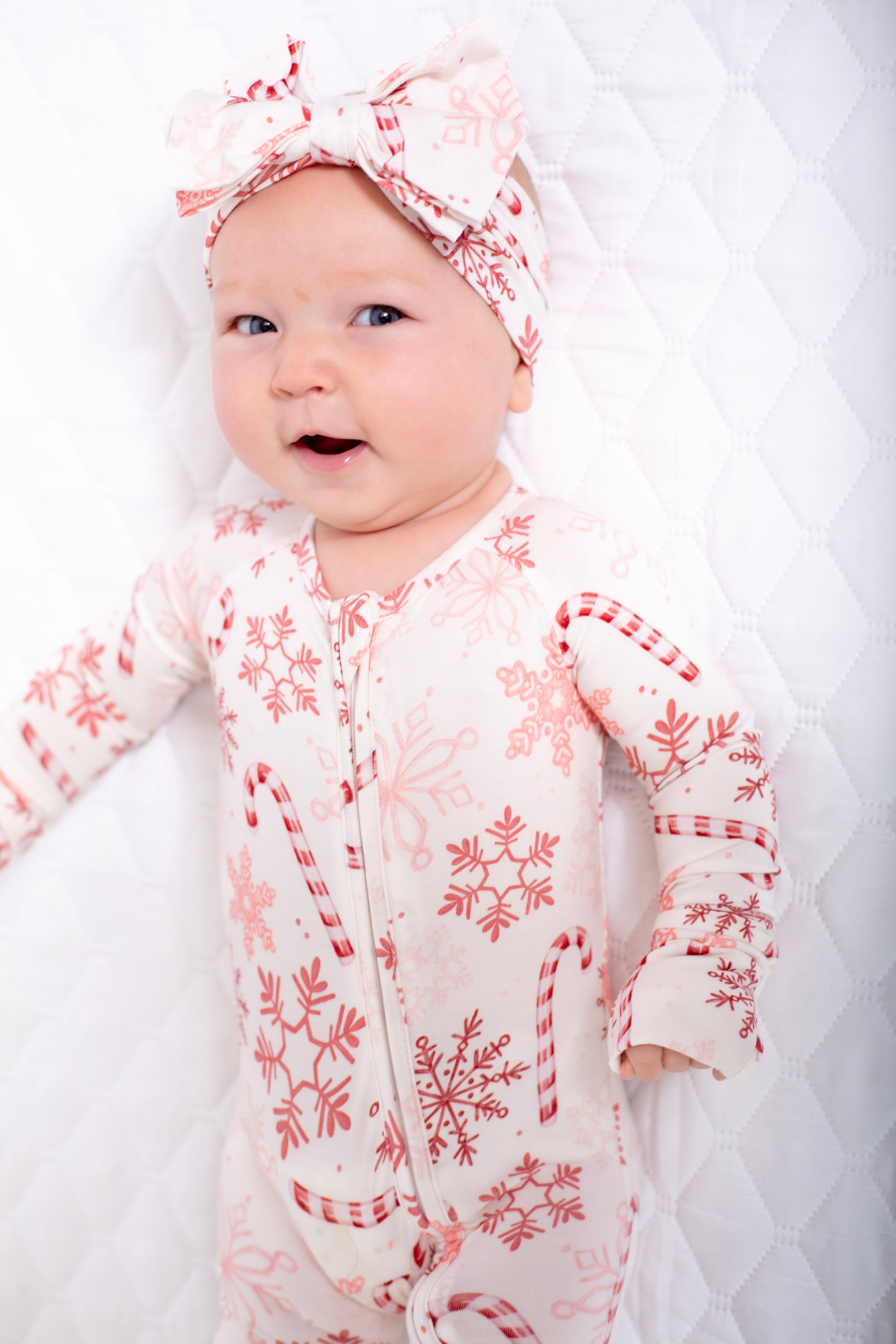 Add the sweetest finishing touch with our Candy Cane Dreams Hair Bows, designed to sprinkle a bit of holiday cheer into every outfit. Featuring our signature peppermint-and-snowflake print on buttery-soft bamboo fabric, these bows are both festive and functional—made to stay put through cookie decorating, gift unwrapping, and twinkle-lit photo ops.