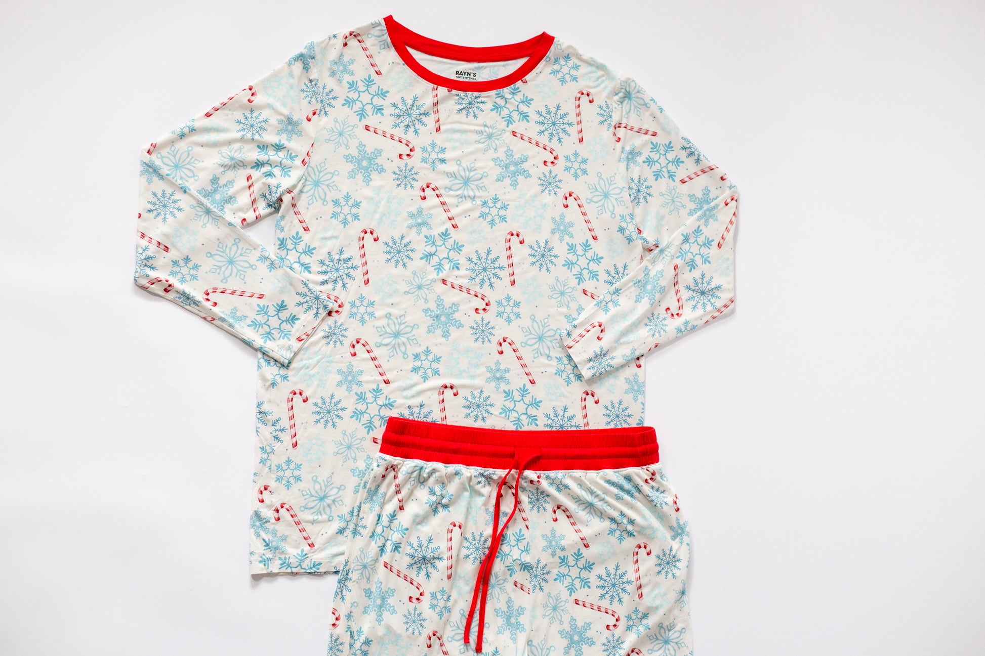 An elegant winter white base is sprinkled with frosted aqua snowflakes and hand-drawn peppermint candy canes. Finished with confident red trim, it’s festive without feeling kitschy—perfect for family photos, cocoa runs, and those “just one more chapter” bedtime reads.
