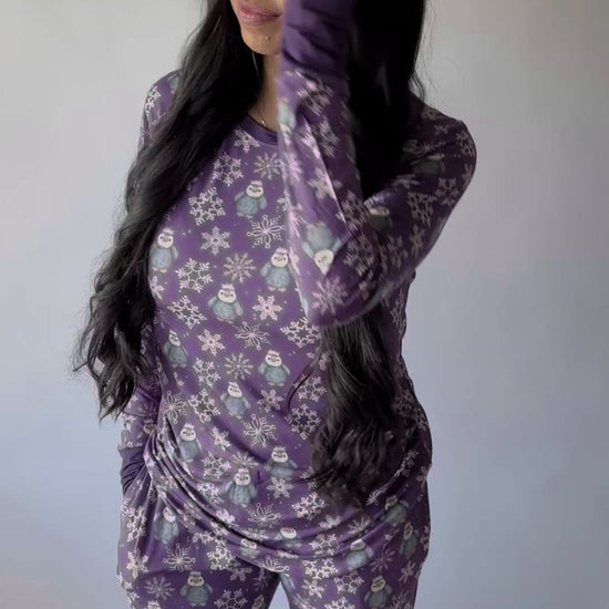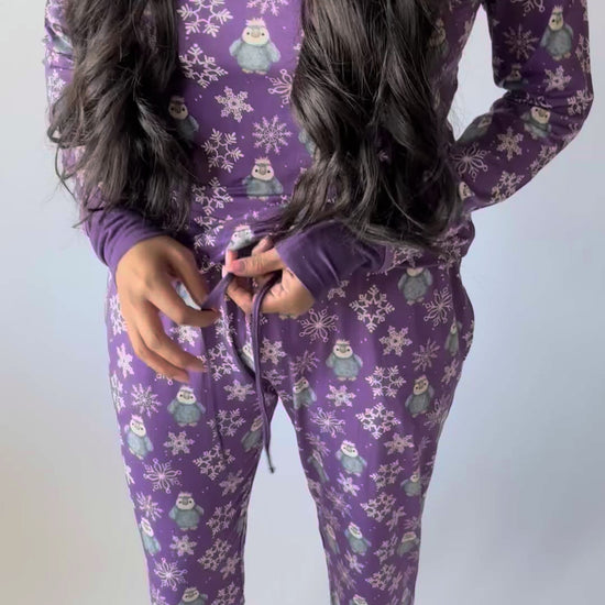 Wrap yourself in winter joy with our Women’s Purple Penguin Jogger Pajamas — a dreamy blend of cozy and playful. Featuring our signature watercolor-style penguins and hand-drawn snowflakes on a rich purple background, this set feels like a soft winter morning you never want to end.