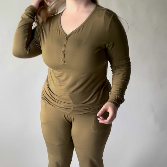 Women's Solid Long Sleeve Button Pajamas: Olive Color